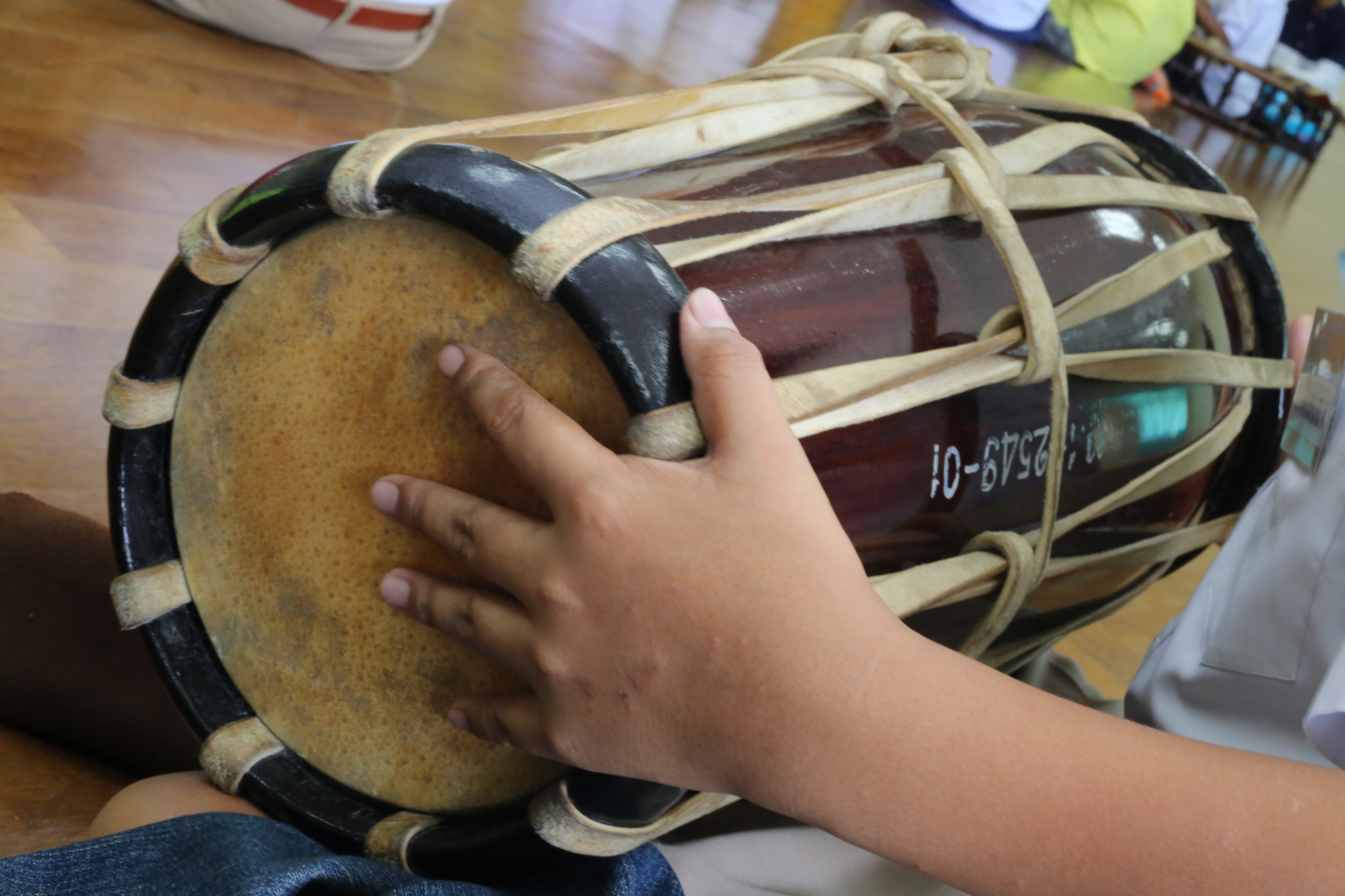 | คำอธิบาย : กลองแขกเป็นเครื่องดนตรีประเภทตีที่มีรูปร่างยาวเป็นรูปทรง กระบอก ขึ้นหนังสองข้างด้วย หนังลูกวัว หรือหนังแพะหน้าใหญ่ กว้างประมาณ 20 ซม เรียกว่า “หน้ารุ่ย” ส่วนหน้าเล็กกว้างประมาณ 17 ซม เรียกว่า“หน้าด่าน” ตัวกลองแขกทำด้วยไม้แก่น เช่นไม้ชิงชันหรือไม้มะริดการ ขึ้นหนังใช้เส้นหวายผ่า ซีกเป็นสายโยง เร่งเสียง โยงเส้นห่างๆในปัจจุบันอาจใช้เส้นหนังแทนเนื่อง จากหาหวายได้ยาก กลองแขก สำหรับหนึ่งมี 2 ลูกลูกเสียง สูงเรียก “ตัวผู้” ลูกเสียงต่ำเรียก “ตัวเมีย” ตีด้วยฝ่ามือทั้งสองข้างให้สอดสลับ กันทั้งสองลูก |