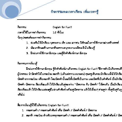 | คำอธิบาย : 1. ส่งเสริมให้นักเรียน บุตรหลาน เด็ก และ เยาวชน มีทักษะในการใช้ภาษาอย่างสร้างสรรค์ 2. พัฒนาทักษะด้านภาษาด้วยความสนุกสนานเพลิดเพลินในเรียนรู้3. ฝึกฝนการใช้ภาษาอังกฤษ และรู้จักคำศัพท์ภาษาอังกฤษ |