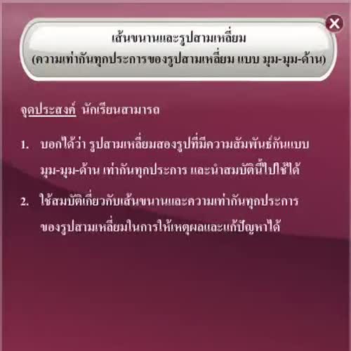 | ชื่อเรื่อง : เส้นขนานและรูปสามเหลี่ยม (ความเท่ากันทุกประการของรูปสามเหลี่ยมแบบ มุม-มุม-ด้าน) |