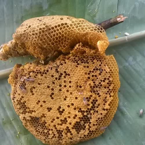 | คำอธิบาย : รังผึ้งมิ้ม หรือตัวอ่อนผึ้งมิ้ม ที่หาได้จากป่าธรรมชาติ เป็นอาหารป่ายอดนิยมของชาวบ้านที่สามารถนำมารับประทานหรือนำมาประกอบเป็นอาหารได้ |