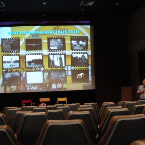 | คำอธิบาย : บรรยากาศจำลองมาจากโรงภาพยนตร์ หรือโรงหนังจริง ในภาพคุณมนัส กิ่งจันทร์ นักจดหมายเหตุ แห่งหอภาพยนตร์แห่งชาติ นักเล่าเรื่องหนังไทยในนิตยสาร Film And Star และเจ้าของกระทู้ชุมทางหนังไทยในอดีต www.thaifilm.com รับหน้าที่เป็นวิทยากรบรรยายความเป็นมาของหอภาพยนตร์ |