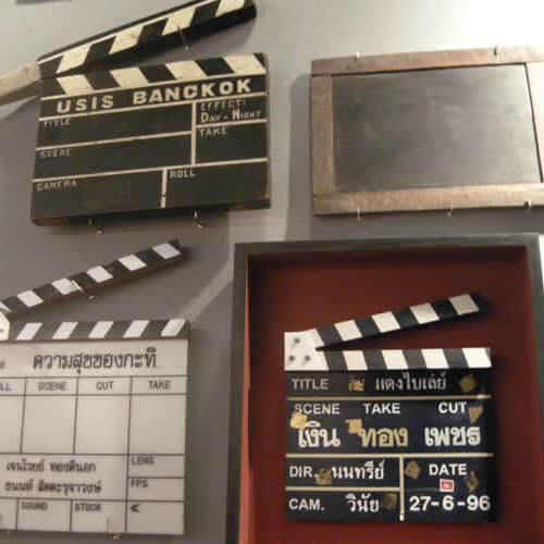 | คำอธิบาย : ไม้ตะขาบ หรือสเลท (Slate) แผ่นป้ายบอกฉากที่ฝรั่งเรียกว่า แคลปเปอร์บอร์ด (Clapper Board) ในรูปแบบต่าง ๆ ที่ติดอยู่ตามผนังหลายอัน เป็นสเลทที่ใช้จริงในการกำกับภาพยนตร์ โดยผู้กำกับหลายคนได้มอบไว้เพื่อเป็นการมอบความทรงจำแก่คนรุ่นหลังตามที่เห็นจากภาพ |
