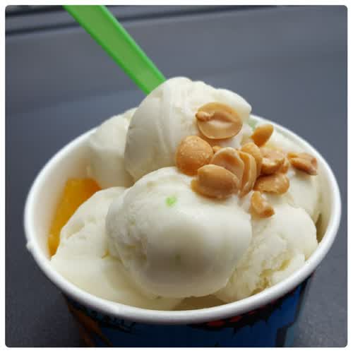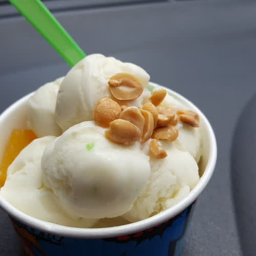 | คำอธิบาย : ไอศครีมกะทิสด เป็นขนมประเภทไอศกรีมของหวานเย็นที่ประยุกต์ให้เข้ากับรสชาติความเป็นไทยโดยใช้กะทิเป็นส่วนประกอบ มักโรยหน้าด้วยถั่วลิสงคั่ว คงเอกลักษณ์ความเป็นไทย |