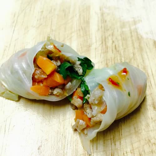 | คำอธิบาย : อาหารว่างที่มีส่วนผสมคล้ายก๋วยเตี๋ยวลุยสวน แต่เปลี่ยนจากแผ่นแป้งมาเป็นกะหล่ำปลีลวกแทน |