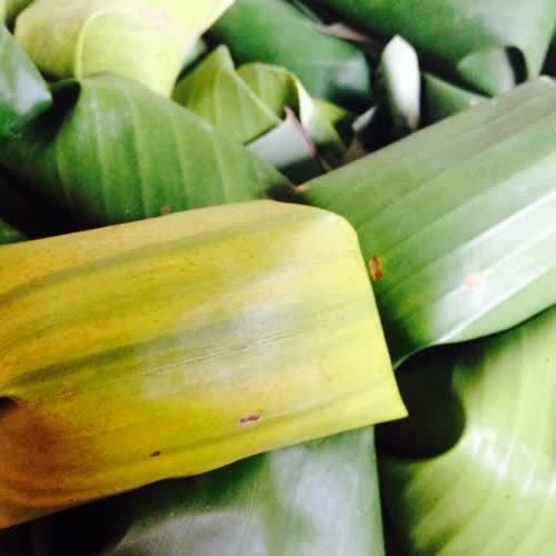 | คำอธิบาย : ห่อเสร็จจัดวางเรียงไว้เพื่อรอการนำไปนึ่ง หากประกบคู่แล้วมัดด้วยตอกสามารถทำให้สุกด้วยการต้มก็ได้ |