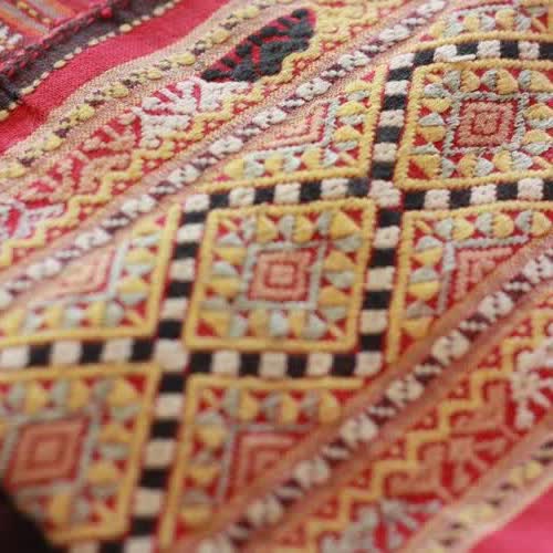 | คำอธิบาย : ผ้าลาวพวน เป็นผ้าไหม ผสมฝ้าย ไหมผสมฝ้าย ผ้าคลุมหัวนาก ลายนาก ชุดความเชื่อมาจากนายาง หลวงพระบาง ยายเฒ่าเป็นรุ่นที่ 4 จากหลวงพระบาง ตีนซิ่นจบด้วยจก ลายขิดเก็บขิดขึ้นและมัดหมี่ |