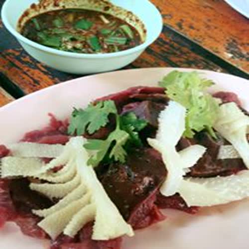 | คำอธิบาย : เป็นการนำเอาเนื้อวัว หรือเนื้อหมูดิบ พร้อมเครื่องในมาซอยเป้นชิ้น กินกับน้ำจิ้มที่เรียกว่า แจ่วเพลี้ย อาจเสี่ยงต่อการเป็นโรคพยาธิได้หากเนื้อที่นำมาทำนั้นมีเม็ดสาคู |