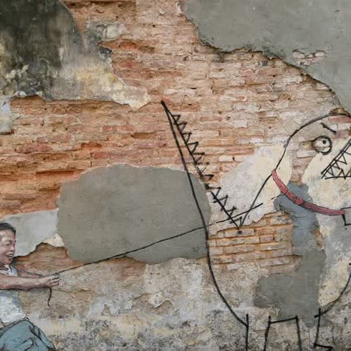 | คำอธิบาย : Street art in George Town มีทั้งภาพวาดและศิลปะเหล็กดัด รูปการ์ตูน |