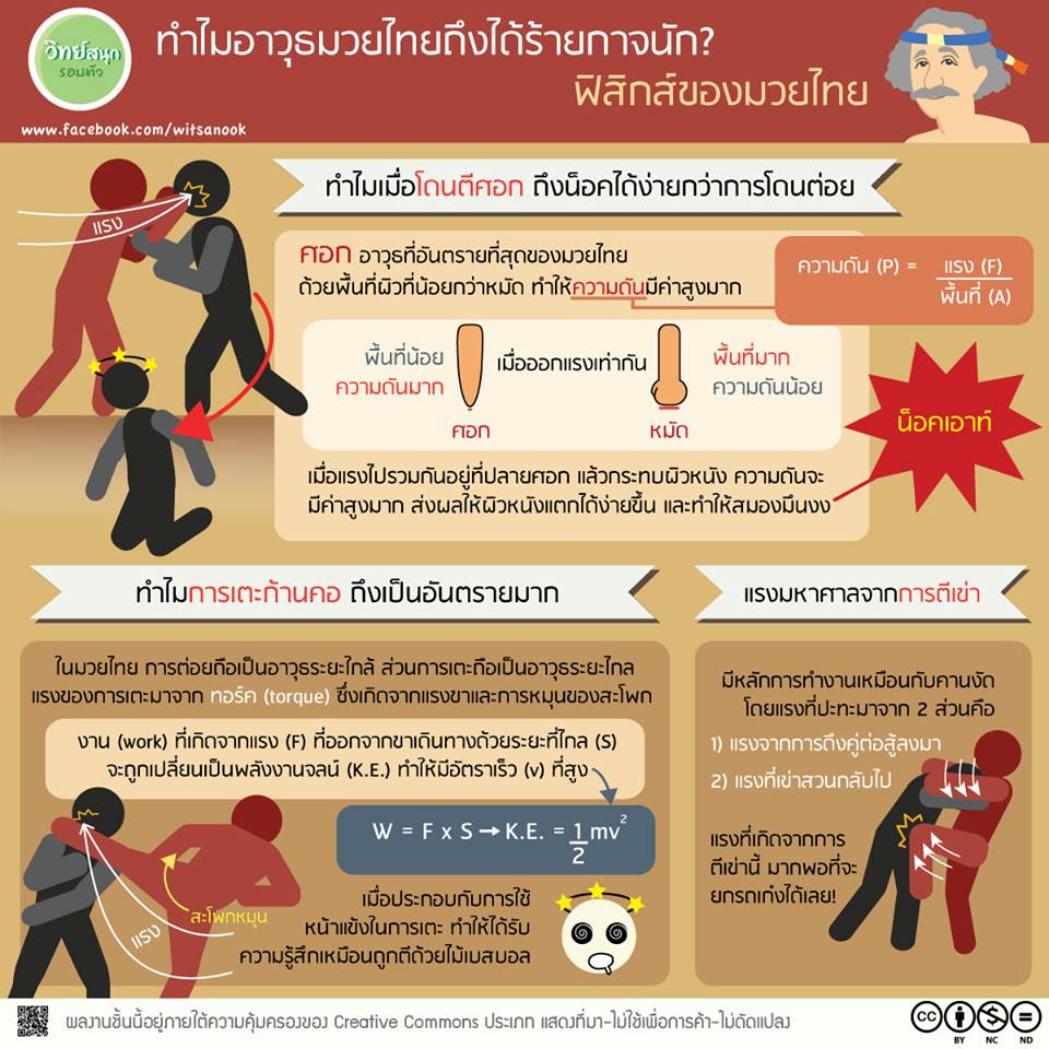 | คำอธิบาย : อาวุธต่างๆ ของมวยไทยไม่ว่าจะเป็น ศอก เข่า หรือ เตะ ล้วนเป็นเอกลักษณ์ที่โดดเด่นของมวยไทย ทำให้มวยไทยกลายเป็นมรดกโลกที่แม้แต่คนต่างชาติก็ฝึกฝนกันจนเป็นที่นิยมทั่วโลก ความอันตรายของอาวุธต่างๆ ของมวยไทยนั้นสามารถถูกอธฺบายได้ด้วยหลักการง่ายๆ ทางฟิสิกส์ การตีศอกสัมพันธ์กับความดัน การเตะก้านคอสัมพันธ์กับการเปลี่ยนงานที่กระทำให้เป็นพลังงานจลน์และถ่ายทอดสู่คู่ต่อสู่ การตีเข่าสัมพันธ์กับหลักการของคานงัด infographic นี้ได้แสดงหลักการเหล่านี้เอาไว้ |