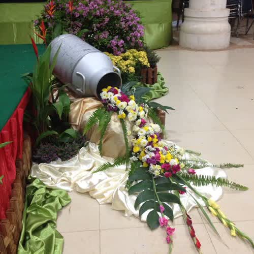 | คำอธิบาย : การจัดและตกแต่งสถานที่สำหรับงานมุทิตาจิตผู้เกษียณอายุราชการ ประจำปี 2559 โดยใช้วัสดุที่เกี่ยวข้องกับการเกษตร เช่น ถังนม และมีดอกไม้ไหลจากถังนม เพื่อให้มีความหมายทางด้านการเกษตร |