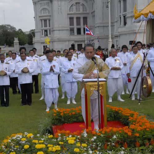 | คำอธิบาย : พระราชพิธีบวงสรวง สมเด็จพระบูรพมหากษัตริยาธิราช ณ พลับพลาพิธี พระที่นั่งอนันตสมาคม วันที่ 9 มิถุนายน 2549 |