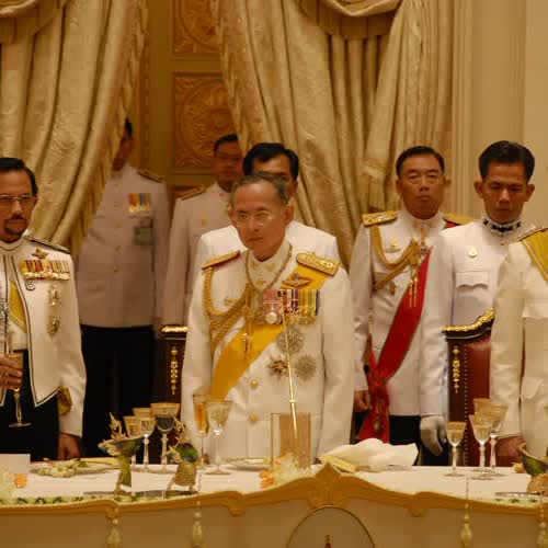 | คำอธิบาย : ถวายพระกระยาหารค่ำแด่พระประมุข และพระราชวงศ์ต่างประเทศ ณ พระที่นั่งบรมราชสถิตยมโหฬาร เมื่อวันที่ 13 มิถุนายน 2549 |