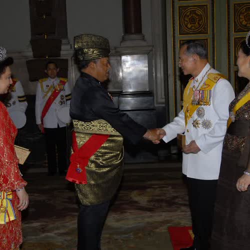| คำอธิบาย : ถวายพระกระยาหารค่ำแด่พระประมุข และพระราชวงศ์ต่างประเทศ ณ พระที่นั่งบรมราชสถิตยมโหฬาร เมื่อวันที่ 13 มิถุนายน 2549 |