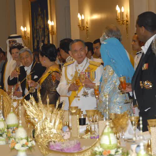 | คำอธิบาย : ถวายพระกระยาหารค่ำแด่พระประมุข และพระราชวงศ์ต่างประเทศ ณ พระที่นั่งบรมราชสถิตยมโหฬาร เมื่อวันที่ 13 มิถุนายน 2549 |