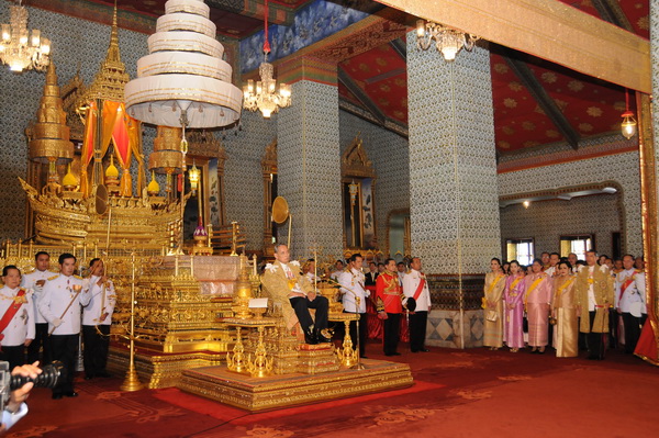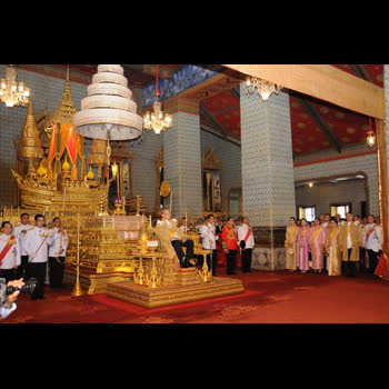 | คำอธิบาย : วันที่ 5 ธันวาคม 2552 เวลา 11.14 น. พระบาทสมเด็จพระเจ้าอยู่หัว ประทับเหนือพระที่นั่งพุดตานกาญจนสิงหาสน์ บนพระราชบัลลังก์ภายใต้นพปฎลมหาเศวตฉัตร เสด็จออกมหาสมาคม สมเด็จพระนางเจ้าฯ พระบรมราชินีนาถ พระบรมวงศ์และข้าราชการ เฝ้าทูลละอองธุลีพระบาท เนื่องในพระราชพิธีเฉลิมพระชนมพรรษา ณ พระที่นั่งอมรินทรวินิจฉัย ในพระบรมมหาราชวัง |