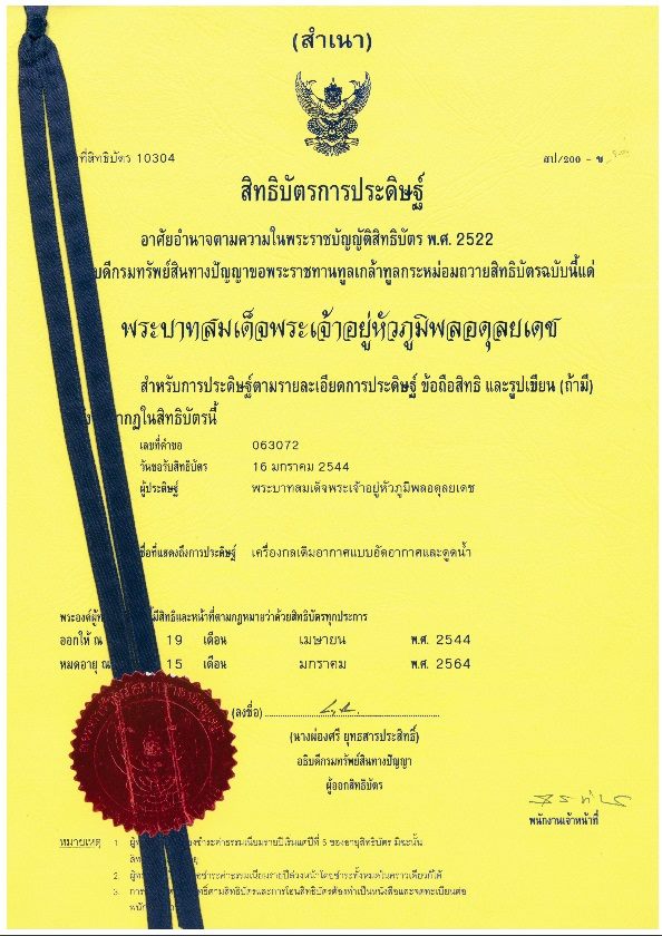 "สิทธิบัตรในพระปรมาภิไธยเลขที่ 10304 เครื่องกลเติมอากาศแบบอัดอากาศและดูดน้ำ".