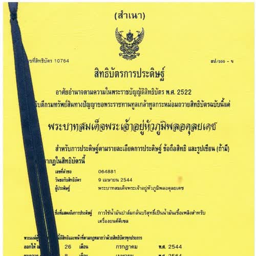 "สิทธิบัตรในพระปรมาภิไธยเลขที่ 10764 การใช้น้ำมันปาล์มกลั่นบริสุทธิ์เป็นน้ำมันเชื้อเพลงสำหรับเครื่องยนต์ดีเซล".