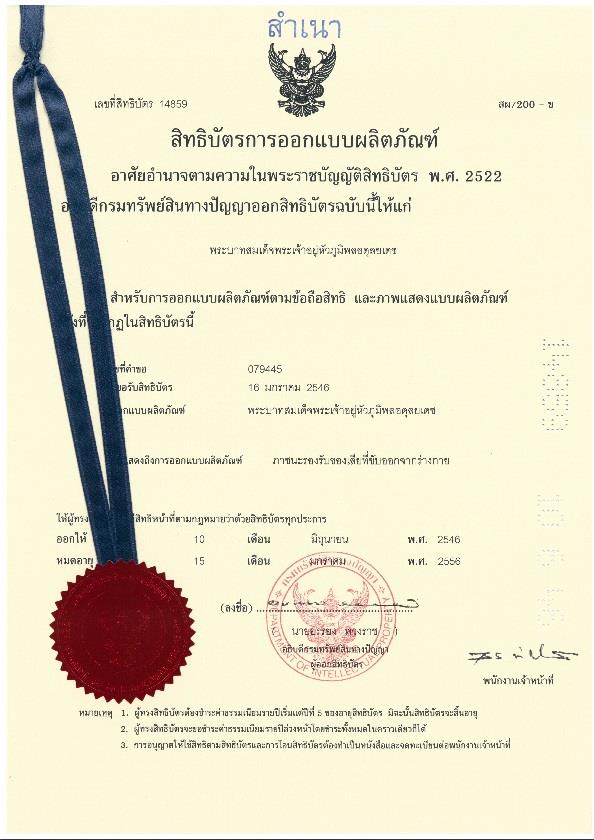 "สิทธิบัตรในพระปรมาภิไธยเลขที่ 14859 ภาชนะรองรับของเสียที่ขับออกจากร่างกาย".