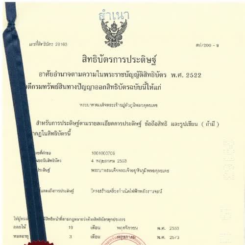 | คำอธิบาย : สิทธิบัตรในพระปรมาภิไธยเลขที่ 29162 เครื่องกำเนิดไฟฟ้าพลังงานจลน์ |