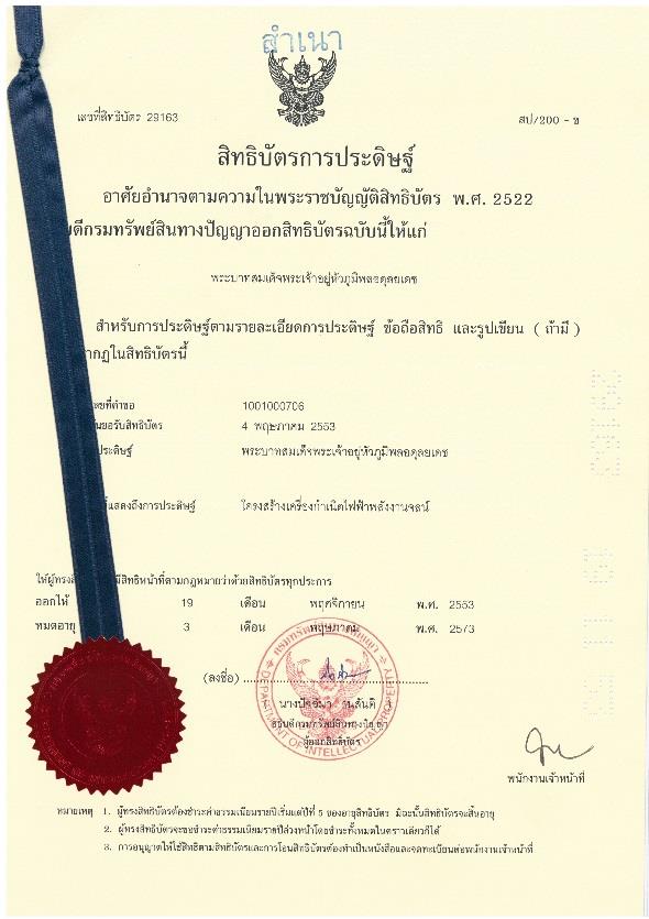 "สิทธิบัตรในพระปรมาภิไธยเลขที่ 29162 เครื่องกำเนิดไฟฟ้าพลังงานจลน์".