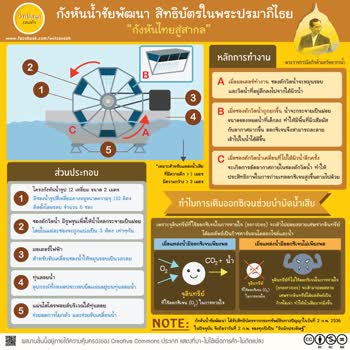 คำอธิบาย : พระบาทสมเด็จพระเจ้าอยู่หัวของปวงชนชาวไทย ทรงมีพระปรีชาสามารถในหลากหลายด้าน ผลงานที่มีชื่อเสียงประจักษ์ไปทั่วโลกด้านทรัพยากรน้ำ ได้แก่ กังหันน้ำชัยพัฒนา ที่เป็นสิทธิบัตรในพระปรมาภิไธย infographic นี้อธิบายหลักการการบำบัดน้ำเสียของกังหันน้ำชัยพัฒนา |