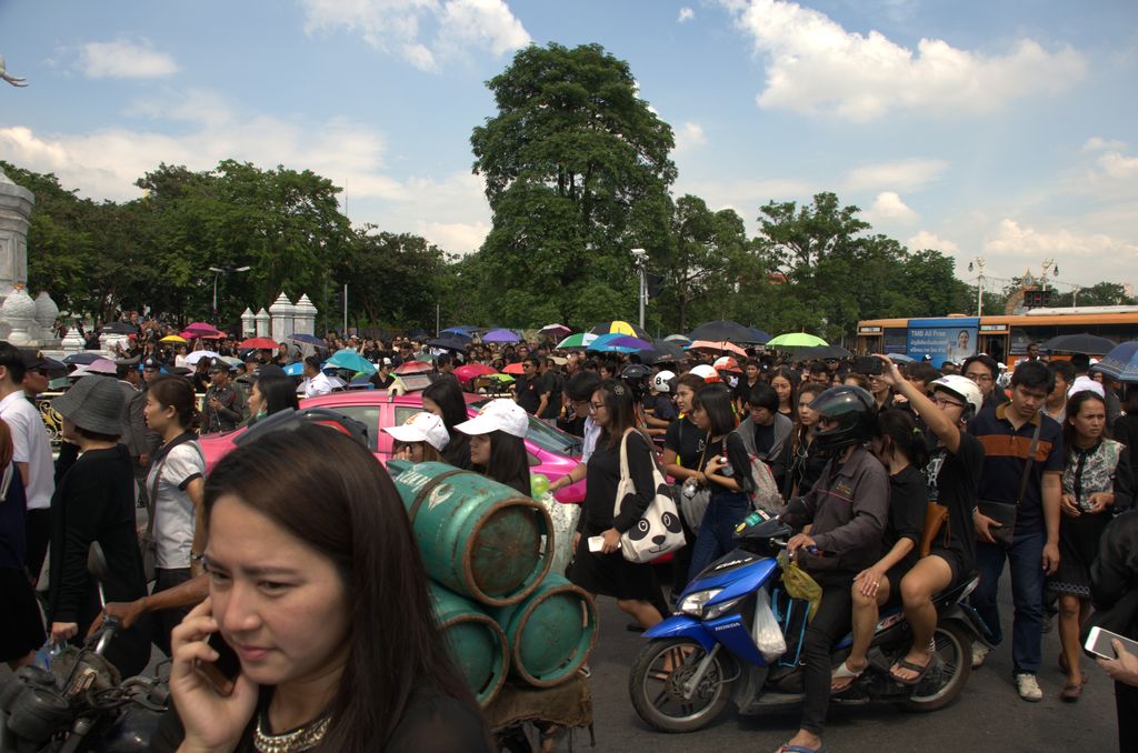 บรรยากาศพสกนิกรไทยเดินทางไปรอรับขบวนเคลื่อนพระบรมศพพระบาทสมเด็จพระเจ้าอยู่หัวในพระบรมโกศ