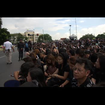 | คำอธิบาย : บรรยากาศการเคลื่อนขบวนพระบรมศพพระบาทสมเด็จพระเจ้าอยู่หัวในพระบรมโกศ พสกนิกรไทยพร้อมใจแต่งชุดดำ รอรับขบวนเคลื่อนพระบรมศพเนืองแน่นที่บริเวณท้องสนามหลวง |
