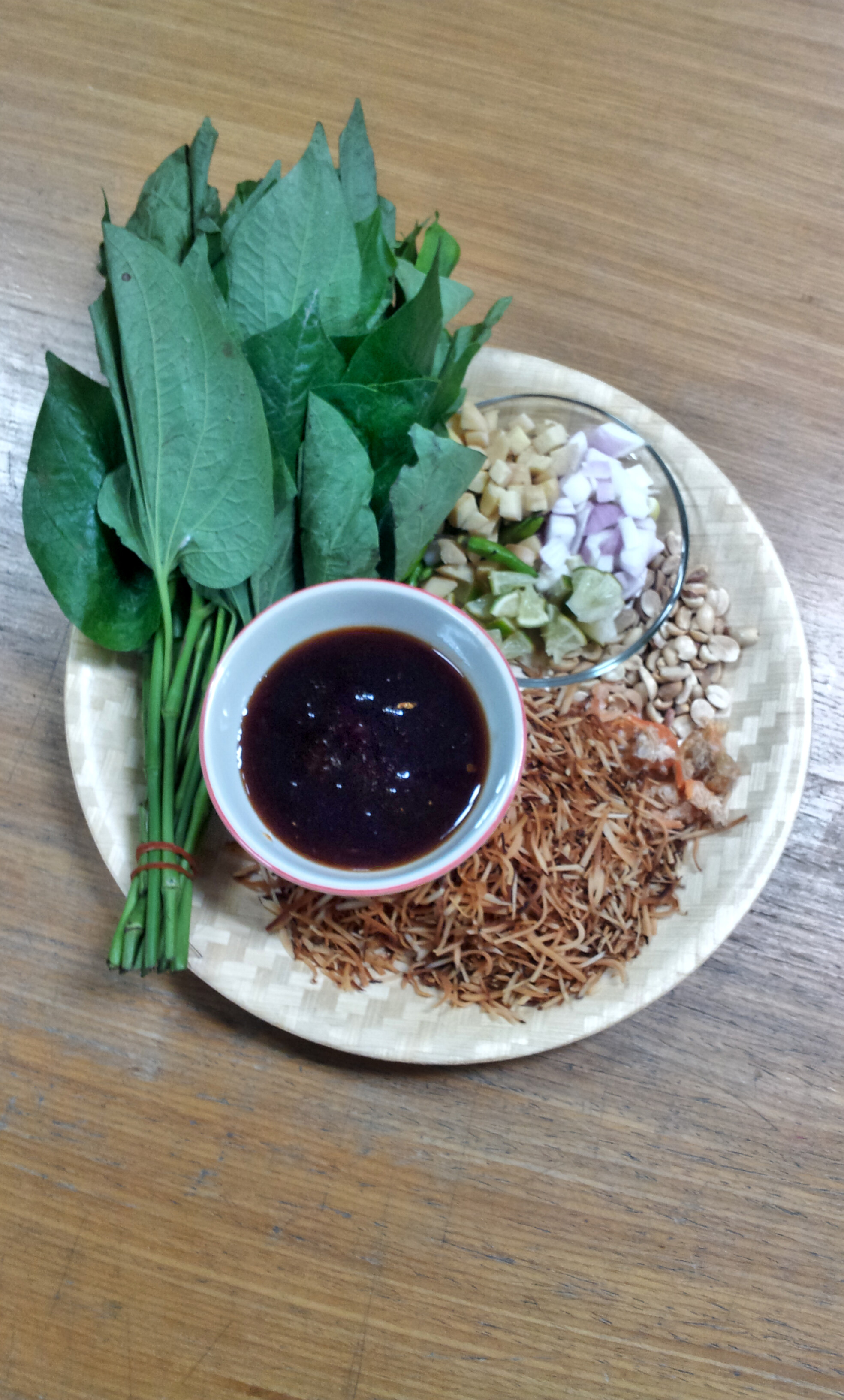 คำอธิบาย : เมี่ยงคำเป็นอาหารว่างชนิดหนึ่งที่มีคุณค่าสมุนไพร ประกอบด้วย ใบชะพลู ถั่วลิสง กุ้งแห้ง ขิงแก่ มะพร้าวคั่ว หัวหอมแดง มะนาว พริก (เพิ่มรสชาติ) เวลาบริโภคมักนำมาหอเป็นคำ |
