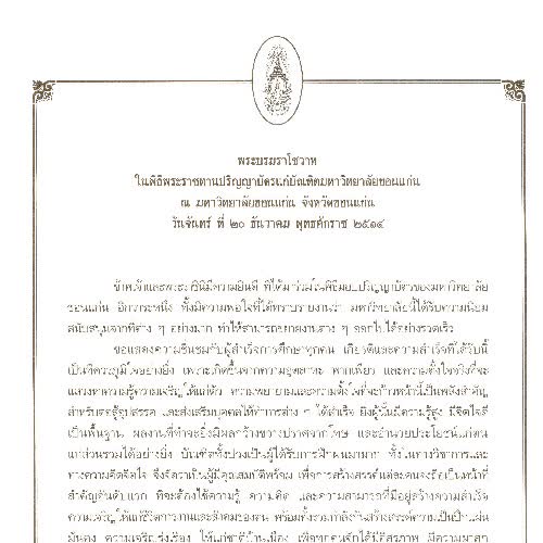 | คำอธิบาย : พระบรมราโชวาทพระบาทสมเด็จพระปรมินทรมหาภูมิพลอดุลยเดช ในพิธีพระราชทานปริญญาบัตรแก่บัณฑิตมหาวิทยาลัยขอนแก่น ณ มหาวิทยาลัยขอนแก่น จังหวัดขอนแก่น |
