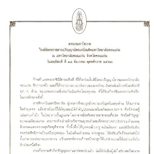 | คำอธิบาย : พระบรมราโชวาทพระบาทสมเด็จพระปรมินทรมหาภูมิพลอดุลยเดช ในพิธีพระราชทานปริญญาบัตรแก่บัณฑิตมหาวิทยาลัยขอนแก่น ณ มหาวิทยาลัยขอนแก่น จังหวัดขอนแก่น |