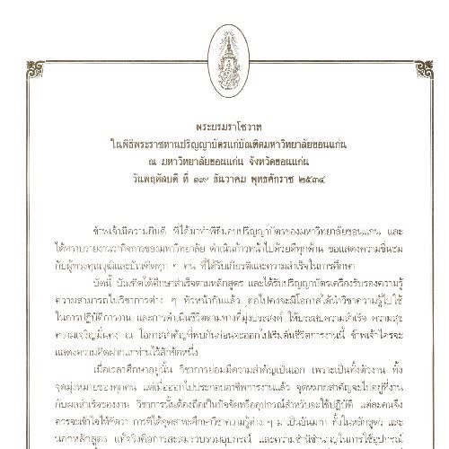 | คำอธิบาย : พระบรมราโชวาทพระบาทสมเด็จพระปรมินทรมหาภูมิพลอดุลยเดช ในพิธีพระราชทานปริญญาบัตรแก่บัณฑิตมหาวิทยาลัยขอนแก่น ณ มหาวิทยาลัยขอนแก่น จังหวัดขอนแก่น |