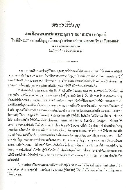 | คำอธิบาย : พระราโชวาท สมเด็จพระเทพรัตนราชสุดาฯ สยามบรมราชกุมารี ในพิธีพระราชทานปริญญาบัตรแก่บัณฑิตมหาวิทยาลัยขอนแก่น ณ มหาวิทยาลัยขอนแก่น วันจันทร์ ที่ 25 ธันวาคม พ.ศ.2538 |