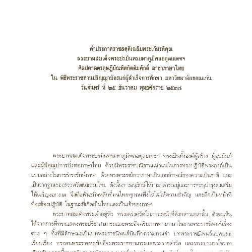 | คำอธิบาย : คำประกาศราชสดุดีเฉลิมพระเกียรติคุณ พระบาทสมเด็จพระปรมินทรมหาภูมิพลอดุลยเดช ศิลปศาสตรดุษฎีบัณฑิตกิตติมศักดิ์ สาขาภาษาไทย ในพิธีพระราชทานปริญญาบัตรแก่ผู้สำเร็จการศึกษา มหาวิทยาลัยขอนแก่น วันจันทร์ ที่ 25 ธันวาคม 2538 |