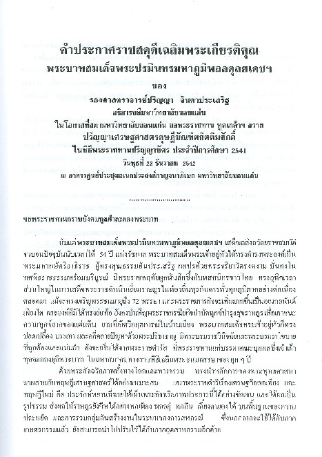 | คำอธิบาย : คำประกาศราชสดุดีเฉลิมพระเกียรติคุณ พระบาทสมเด็จพระปรมินทรมหาภูมิพลอดุลยเดช เศรษฐศาสตรดุษฎีบัณฑิตกิตติมศักดิ์ ในพิธีพระราชทานปริญญาบัตรแก่ผู้สำเร็จการศึกษา มหาวิทยาลัยขอนแก่น วันพุธ ที่ 22 ธันวาคม 2542 |