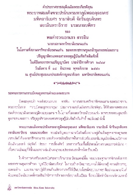 | คำอธิบาย : คำประกาศราชสดุดีเฉลิมพระเกียรติคุณ พระบาทสมเด็จพระปรมินทรมหาภูมิพลอดุลยเดช สัตวแพทยศาสตรดุษฎีบัณฑิตกิตติมศักดิ์ ในพิธีพระราชทานปริญญาบัตรแก่ผู้สำเร็จการศึกษา มหาวิทยาลัยขอนแก่น วันอังคาร ที่ 18 ธันวาคม 2550 |