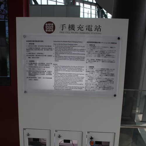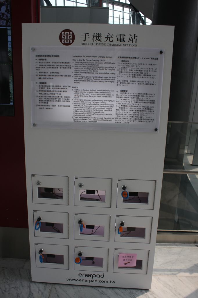 | คำอธิบาย : จุดบริการที่ชาร์ตแบตมือถือฟรีPublic Art in Southern Branch of the National Palace Musuem สาขาภาคใต้ของพิพิธภัณฑ์พระราชวังแห่งชาติ (NPMSB) พิพิธภัณฑ์ตั้งอยู่ที่ Taibao, Chiayi ประเทศไต้หวัน |