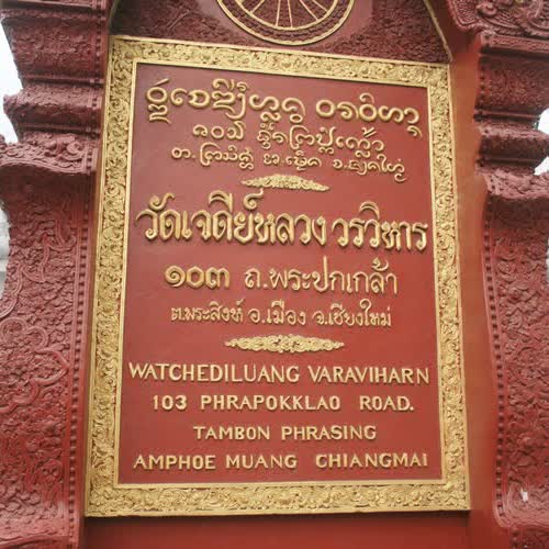 ป้ายวัดเจดีย์หลวงวรวิหาร ได้รับใบอนุญาตภายใต้ ให้เผยแพร่-โดยต้องระบุที่มาแต่ห้ามดัดแปลงและห้ามใช้เพื่อการค้า 3.0 Thailand.