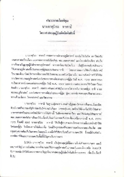 | คำอธิบาย : คำสดุดีเกียรติคุณ นายยาซุโอะ ทาคาอิ ปริญญาวิทยาศาสตรดุษฎีบัณฑิตกิตติมศักดิ์ ในพิธีพระราชทานปริญญาบัตรแก่ผู้สำเร็จการศึกษามหาวิทยาลัยขอนแก่น วันพฤหัสบดี ที่ 19 ธันวาคม 2528 |