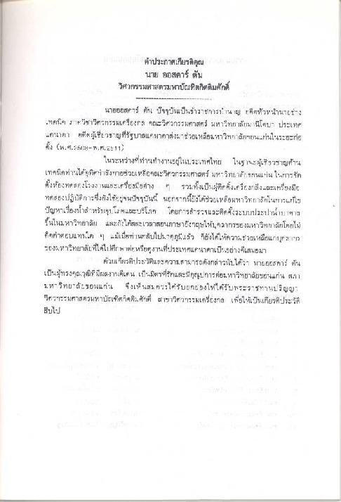 | คำอธิบาย : คำประกาศเกียรติคุณ นายออสคาร์ ตัน ปริญญาวิศวกรรมศาสตรดุษฎีบัณฑิตกิตติศักดิ์ ในพิธีพระราชทานปริญญาบัตรแก่ผู้สำเร็จการศึกษามหาวิทยาลัยขอนแก่น วันพฤหัสบดี ที่ 21 ธันวาคม 2532 |