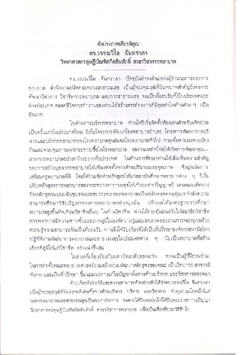 | คำอธิบาย : คำประกาศเกียรติคุณ ดร.วรรณวิไล จันทราภา ปริญญาวิทยาศาสตรดุษฎีบัณฑิตกิตติศักดิ์ สาขาวิชาการพยาบาล ในพิธีพระราชทานปริญญาบัตรแก่ผู้สำเร็จการศึกษามหาวิทยาลัยขอนแก่น วันพฤหัสบดี ที่ 21 ธันวาคม 2532 |