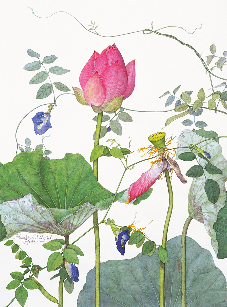 (2563). "ภาพวาดสีน้ำบัวหลวง-อัญชัน".