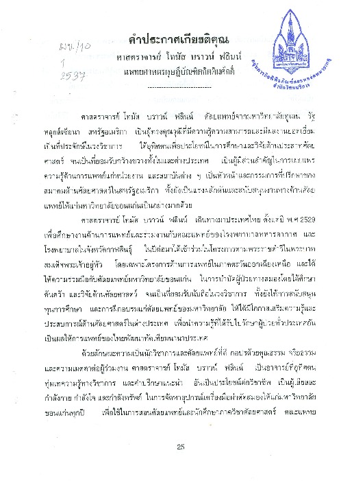 | คำอธิบาย : คำประกาศเกียรติคุณ ศาสตราจารย์โทมัส บราวน์ ฟลินน์ ปริญญาแพทยศาสตรดุษฎีบัณฑิตกิตติมศักดิ์ ในพิธีพระราชทานปริญญาบัตรแก่ผู้สำเร็จการศึกษามหาวิทยาลัยขอนแก่น วันพฤหัสบดี ที่ 15 ธันวาคม 2537 |