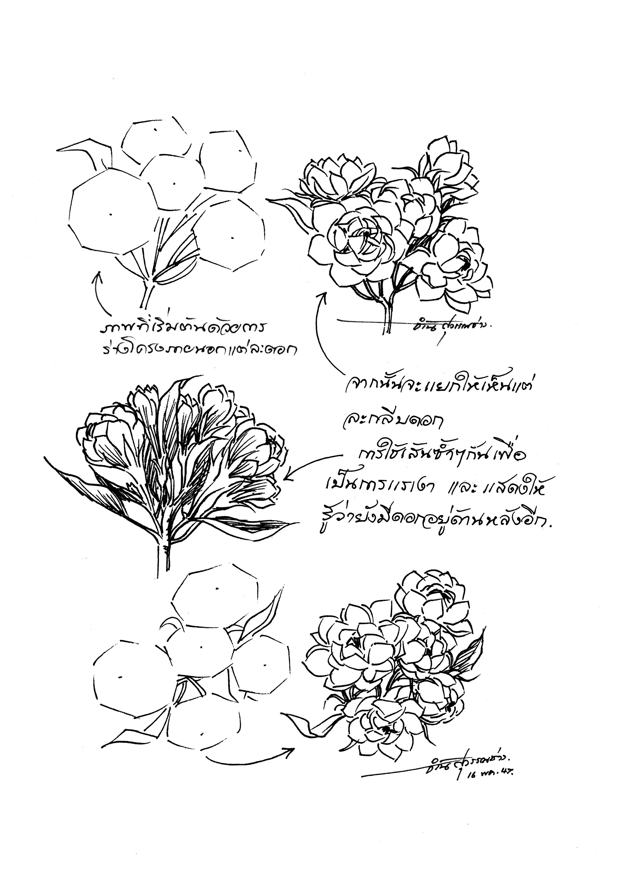 | คำอธิบาย : ภาพเริ่มต้นด้วยการร่างโครงภายนอกของแต่ละดอก |