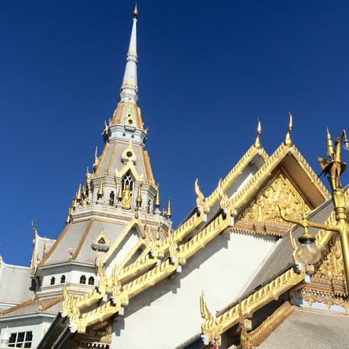 | คำอธิบาย : พระอุโบสถ มีประตูทางเข้า 4 ทิศทาง ผนังก่ออิฐ ผิวผนัง เชิงผนัง เชิงเสา และพนักภายในบุด้วยหินอ่อนทั้งหมด ผนังภายในไม่เขียนภาพจิตรกรรม เป็นเอกลักษณ์เฉพาะที่แตกต่างจากอุโบสถทั่วไป พื้นปูด้วยหินแกรนิตประดิษฐ์เป็นลวดลาย เพดานเป็นรูปทรงโดมแบบตะวันตก เหนือฝ้าเพดานพระอุโบสถขึ้นไปเป็นอาคารทรงมณฑป ประดิษฐานพระสถูปเจดีย์บรรจุพระบรมสารีริกธาตุไว้ หลังคามีลักษณะเป็นจั่วเปิด มุงด้วยกระเบื้องเซรามิกสี่ด่อน ตกแต่งด้วยช่อฟ้าปากปลารวยระกาฝักเพกา และหางหงส์แบบไทย ซึ่งทำด้วยเซรามิกเคลือบน้ำทอง ที่มีเพียงแห่งเดียวในประเทศไทย ด้านข้างมีหลังคาซ้อนกัน 4 ชั้น ด้านยาวหลังคาซ้อนกัน 5 ชั้น หลังคาคลุมมุขโถงอีก 1 ชั้น ส่วนหน้าบัน มีทั้งหมด 8 หน้าบัน 5 แบบ ประดิษฐ์ลวดลายมีความหมายแตกต่างกัน |