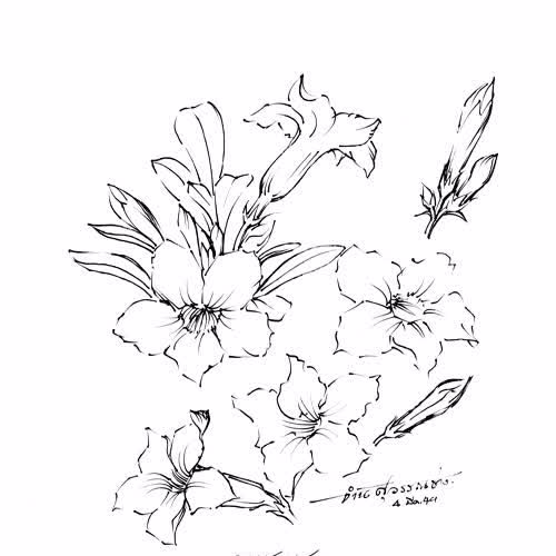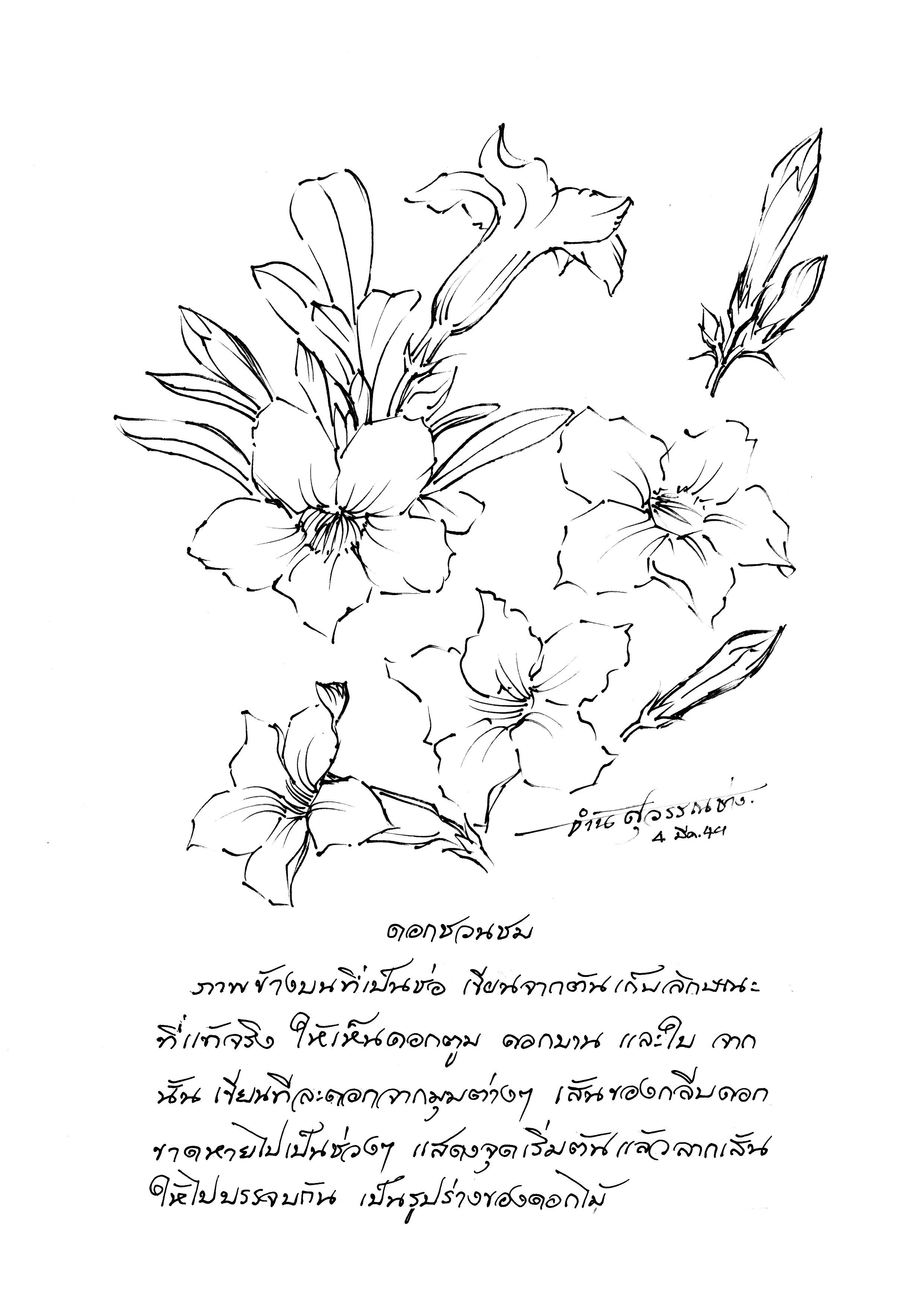 | คำสำคัญ : ภาพลายเส้น, จิตรกรรมรูปดอกไม้, ดอกชวนชม, ภาพเขียน |
