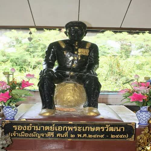 | คำอธิบาย : ข้าจะสู้โดยไม่หวั่นว่าจะไร้ซึ่งลมหายใจ ขอเพียงวันข้างหน้านั้นไซร้ลูกหลานข้ามีแผ่นดินอยู่ : ประวัติศาสตร์เจ้าเมืองจะไม่ถูกลบเลือนหายไปตามกาลเวลา หากลูกหลานถ้วนทั่วหน้ารู้สำนึกบุณคุณผู้สร้างแผ่นดิน รองอำมาตย์เอกพระเกษตรวัฒนา เจ้าเมืองมัญจาคีรีท่านที่ 2 |