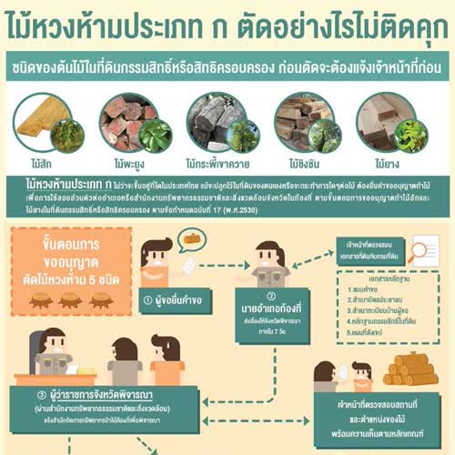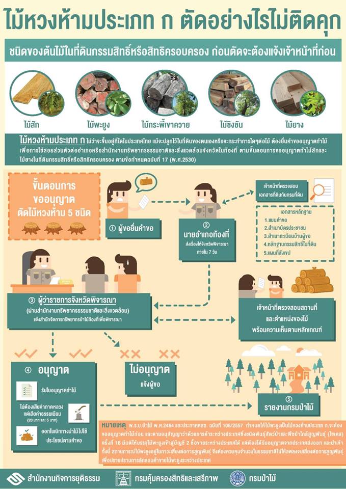 | คำอธิบาย : ไม้หวงห้ามประเภท ก ไม่ว่าจะขึ้นอยู่ที่ใดในประเทศไทย แม้จะปลูกไว้ในที่ดินของตนเองหรือจะกระทำการใดๆ ต่อไม้ ต้องยื่นคำขออนุญาตทำไม้เพื่อการใช้สอยส่วนตัวต่ออำเภอหรือสำนักงานทรัพยากรธรรมชาติและสิ่งแวดล้อมจังหวัดในท้องที่ ตามขั้นตอนการขออนุญาตทำไม้สักและไม้ยางในที่ดินกรรมสิทธิ์หรือสิทธิครอบครอง ตามข้อกำหนดฉบับที่ 17 (พ.ศ.2530) |