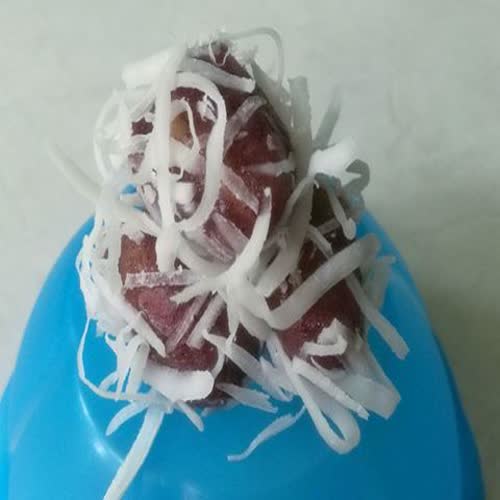 | คำอธิบาย : ขนมปอบแปบ ทำจากแป้งข้าวเหนียวดำใส่ไส้ที่ทำจากถั่วเขียว คลุกด้วยมะพร้าวขูดฝอย |