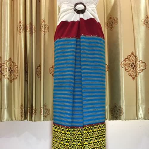 | คำอธิบาย : ตีนจกลายสร้อยกาบหมากต่อซิ่นผ้าฝ้ายตาหมู่ ลักษณะลายจะเลียนแบบลักษณะของกาบต้นหมาก เป็นหนึ่งในผ้าทอลายโบราณ ซึ่งเป็นลวดลายเอกลักษณ์ของชาวไท-ยวน งานหัตถกรรมผ้าทอตีนจกเมืองลอง จากร้านเวียงเหนือ อำเภอลอง จังหวัดแพร่ |
