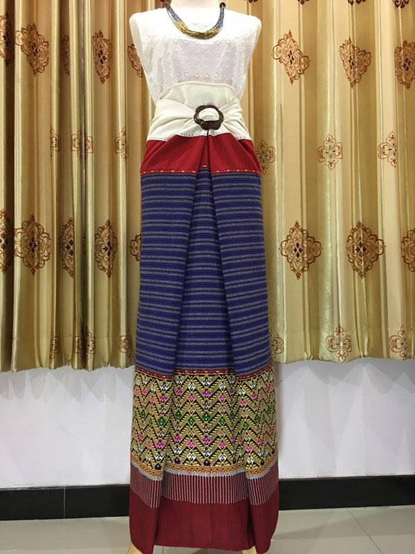 | คำอธิบาย : ตีนจกลายแมงโบ้งเลน ต่อซิ่นผ้าฝ้ายแท้สีธรรมชาติ เป็นชื่อลายหนึ่งในผ้าทอลายโบราณ ซึ่งเป็นลวดลายเอกลักษณ์ของชาวไท-ยวน มีชื่อเรียกอีกอย่างหนึ่งว่าลายโก้งเก้งซ้อนนกคู่ เป็นลายหลัก ลายโก้งเก้งจะเป็นรูปลายหยักและมีนกอยู่ 2 ตัวแทรกอยู่ในลาย งานหัตกรรมผ้าตีนจกเมืองลองจากร้านเวียงเหนือ ผ้าตีนจก จากอำเภอลอง จังหวัดแพร่ |